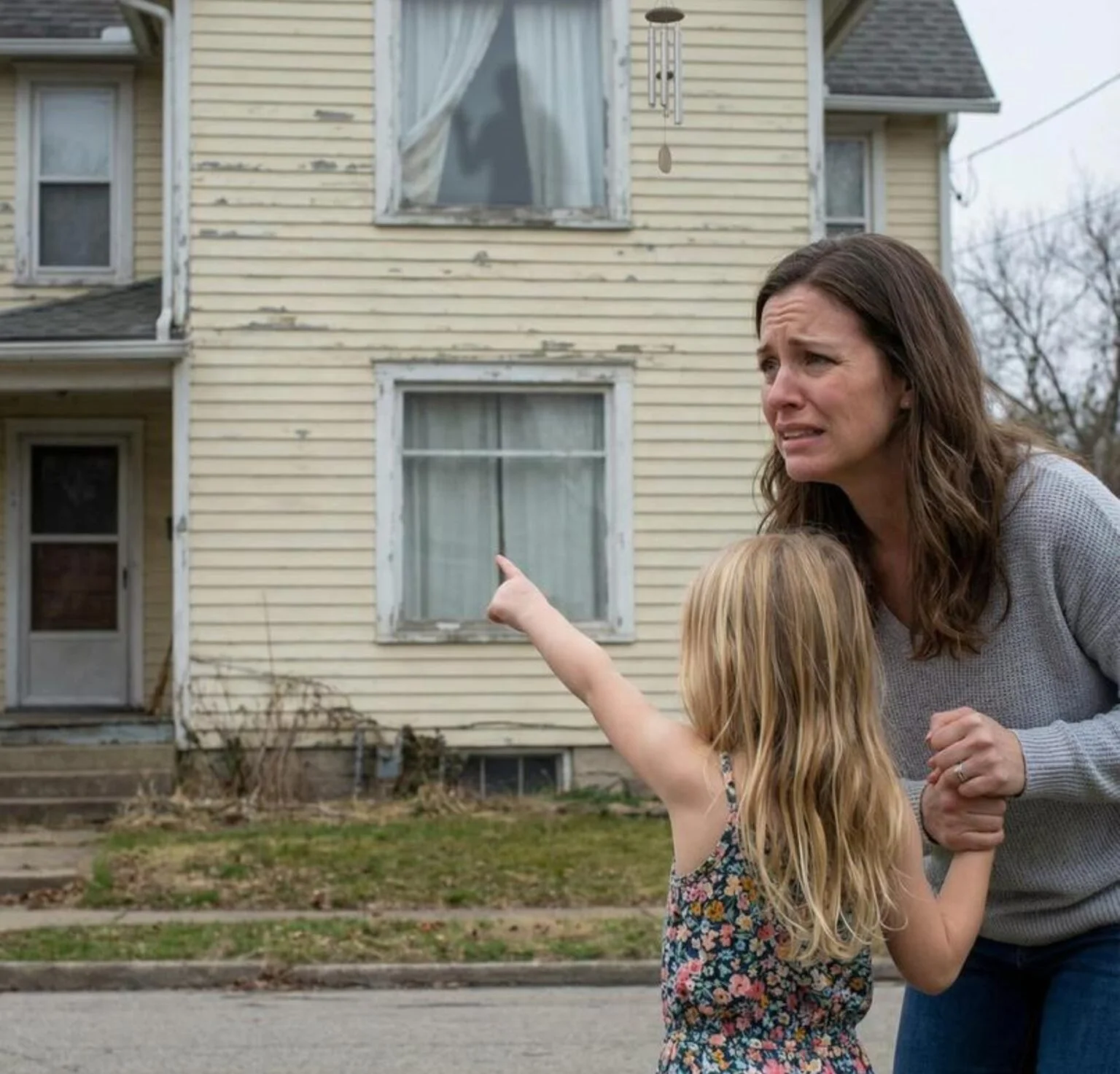 She pointed out the window toward the pale-yellow house across the street—the one that had been empty for months, with wind-chimes that sang even on windless days.