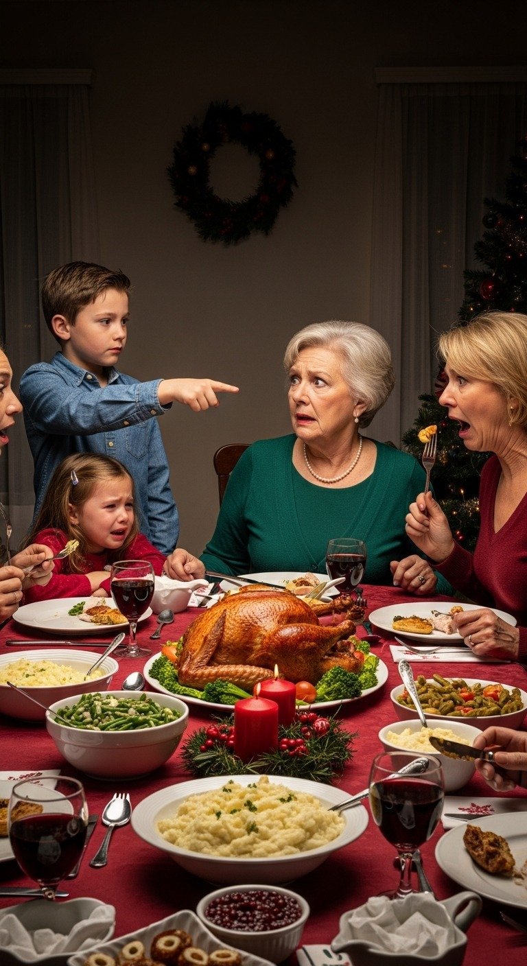 I’ll never forget the sound of my mother-in-law’s hand hitting my five-year-old daughter’s face at Christmas dinner. The sharp crack echoed through that pristine dining room like a gunshot, and twenty relatives just kept eating their glazed ham like nothing had happened. But what my eight-year-old son said next made everyone at that table freeze, and it exposed a secret that would destroy our family forever.