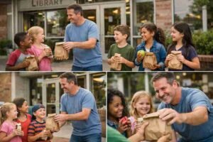 There was Paul, standing quietly outside the library, handing out brown paper lunch bags to a small line of children. They greeted him with smiles and excitement. It was clear they knew him well. In that moment, the truth became obvious—the sandwiches Paul brought to work every day weren’t just for himself. They were part of something much bigger.