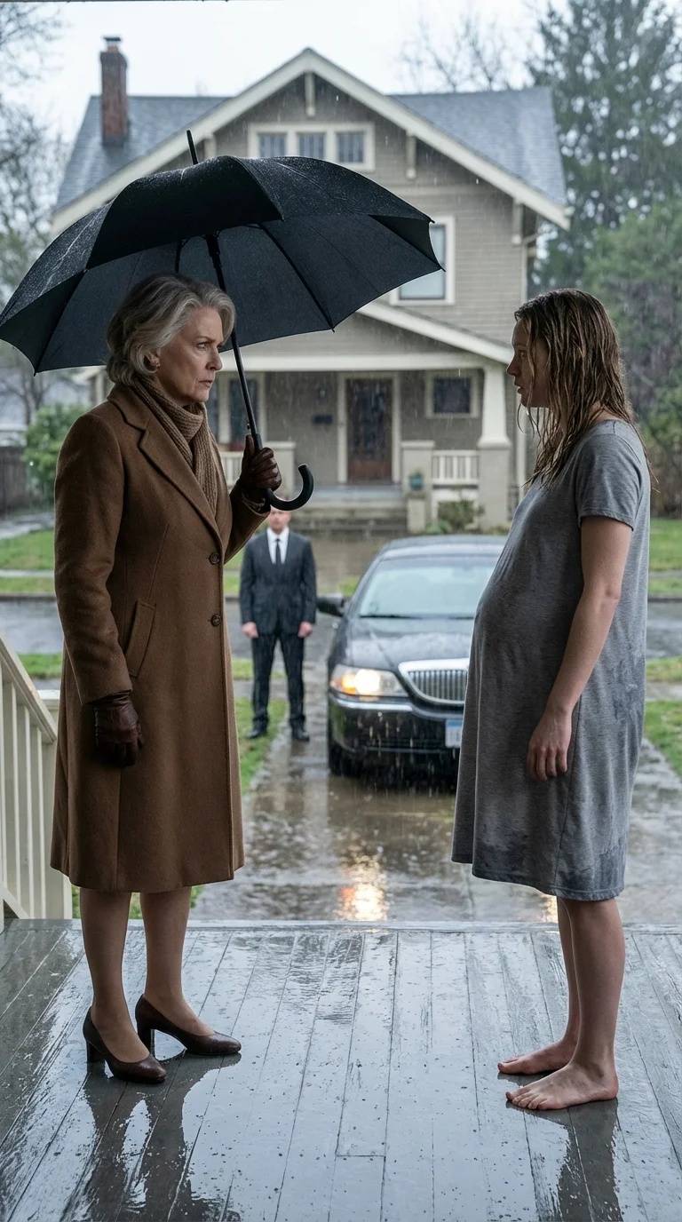 The rain poured without stopping, heavy, cold streams as if the sky had decided to empty itself all at once. The wooden porch had turned slick, water running down the steps and reflecting the dim glow of the porch light. I stood barefoot, pressing my hands to my stomach, feeling the cold seep deeper beneath my skin.
